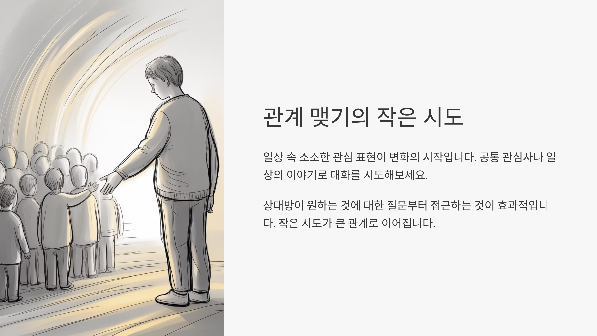 엘리베이터 안에서 '안녕하세요' 한 마디, 동네 카페에서 "오늘 날씨 좋죠?"라고 건네는 말이 어색하게 느껴질 수도 있지만, 이런 아주 작은 시도들이 결국 내 마음의 문을 여는 열쇠가 된답니다. 내가 생각했을 때, 이런 짧은 인사조차 용기라고 느껴졌던 순간이 있었어요.