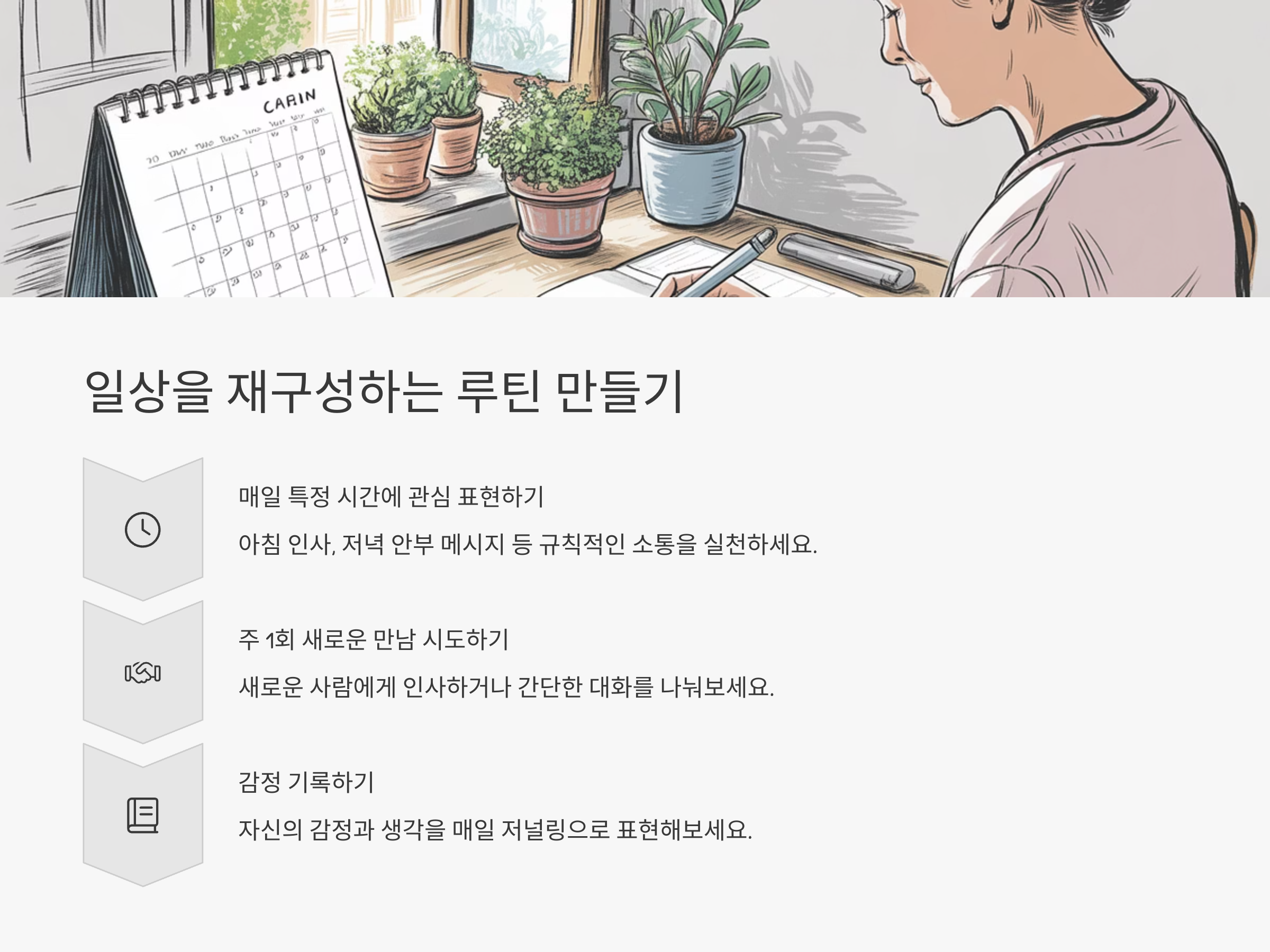 행동 주기 목적 지인 연락 주 1회 사회 연결 유지 일기 쓰기 매일 자기 인식 강화 외출 격일 심리 자극 💬 FAQ
