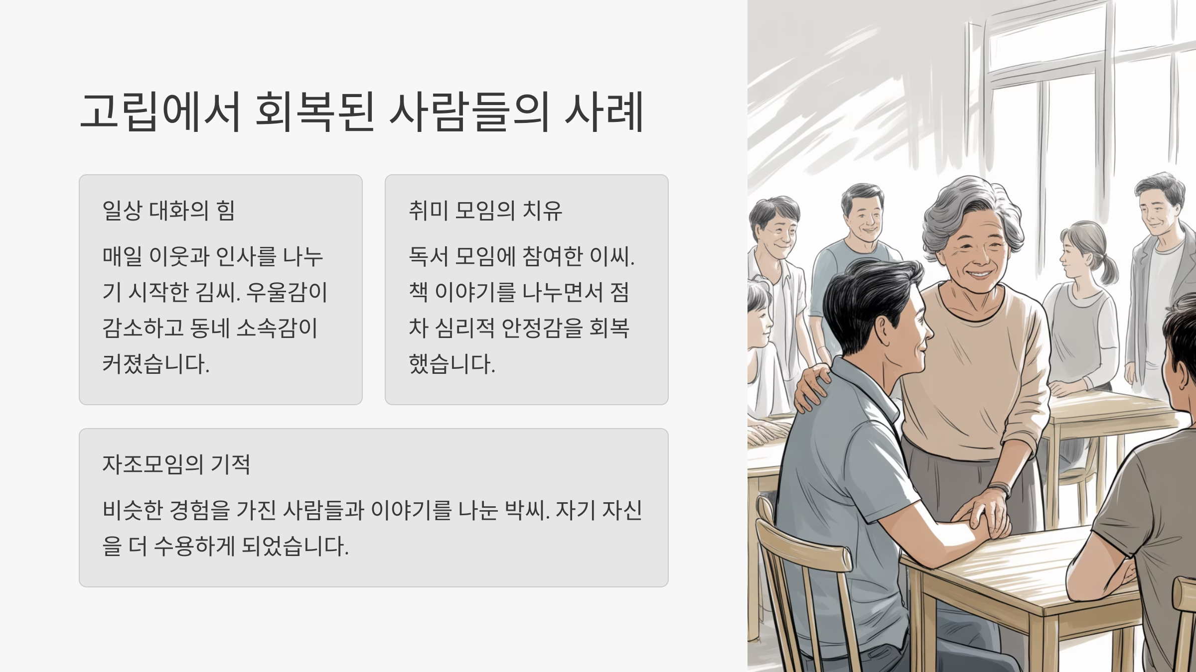 이름 고립 원인 첫 시도 현재 상태 김지훈 직장 스트레스 커뮤니티 글 작성 모임 참여, 자원봉사 박민지 취업 실패 10분 스트레칭 블로그 운영, 자기 루틴 형성 이처럼 모두 거창한 변화가 아니라, 아주 작고 단순한 행동에서 시작됐다는 게 중요해요. 고립된 마음은 겉으로 보이지 않지만, 그 안에서는 수많은 싸움이 일어나고 있어요. 그걸 이겨낸 사람들의 이야기를 통해, ‘나도 가능하다’는 용기를 가져볼 수 있어요.
