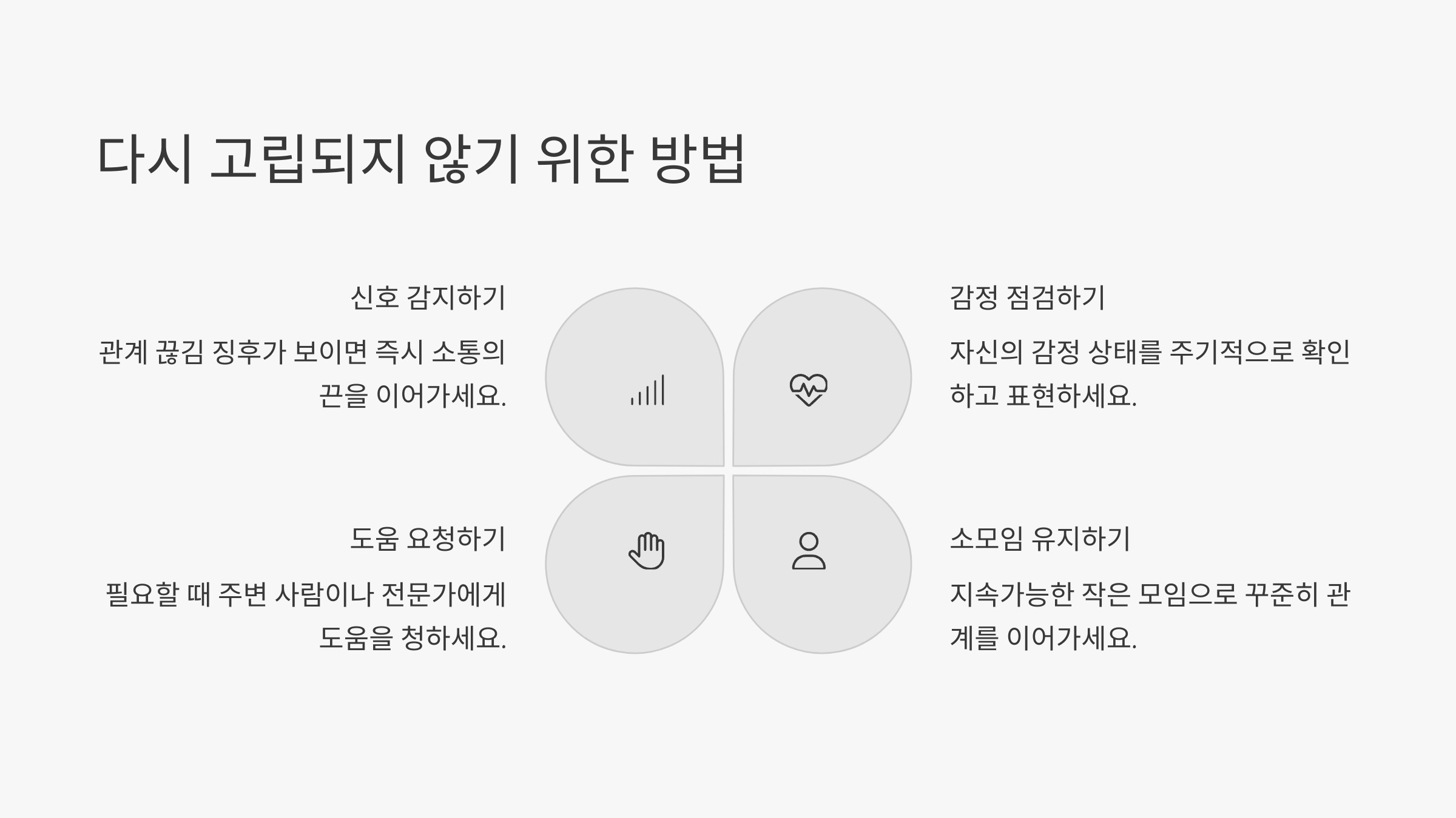 한 번 고립에서 빠져나왔다고 해서 끝이 아니에요. 오히려 그 이후가 더 중요하답니다. 처음의 의욕이 사라지고, 일상이 반복되다 보면 다시 조용히 고립 속으로 빠져드는 일이 많거든요. 그래서 고립되지 않도록 의식적인 노력이 필요해요.