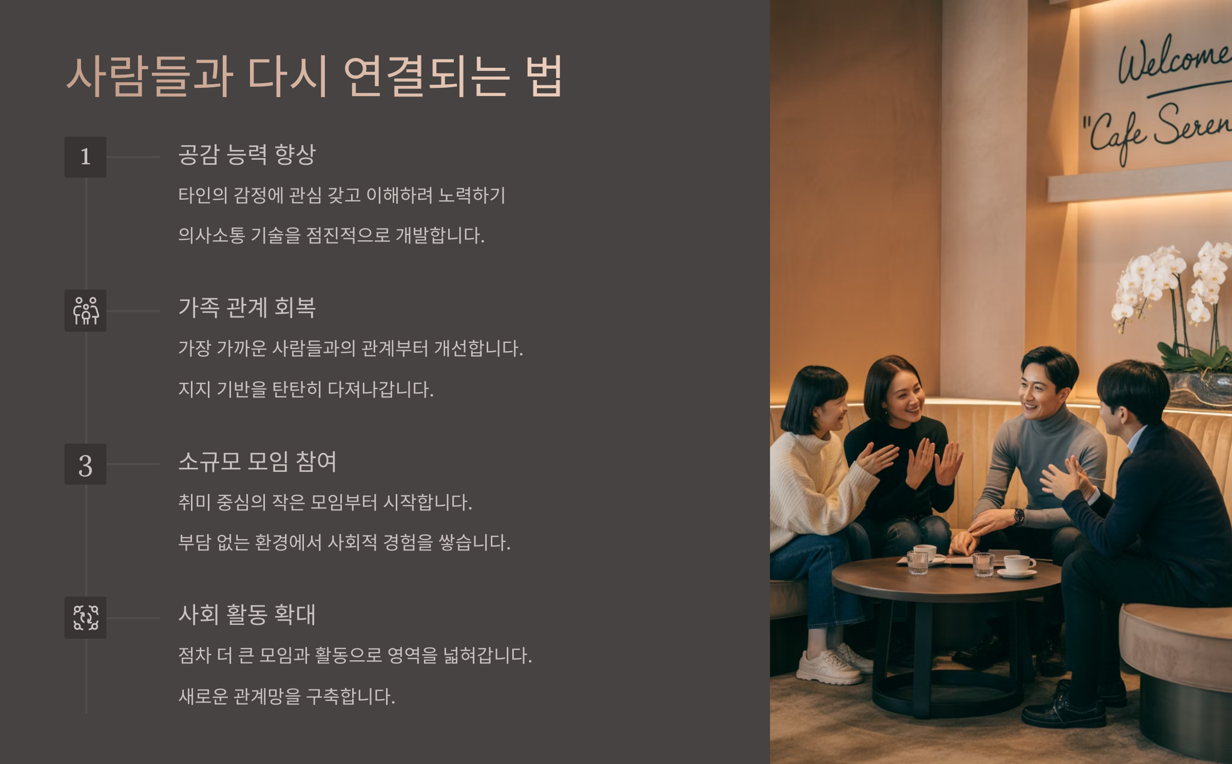 사람들과 다시 연결된다는 건 단순히 외출하거나, 대화를 나누는 걸 넘어서요. 진짜 회복은 ‘내가 누군가에게도 괜찮은 사람’이라는 믿음을 갖는 데서 시작돼요. 그 믿음이 쌓이면 타인의 시선이 두렵지 않게 돼요.