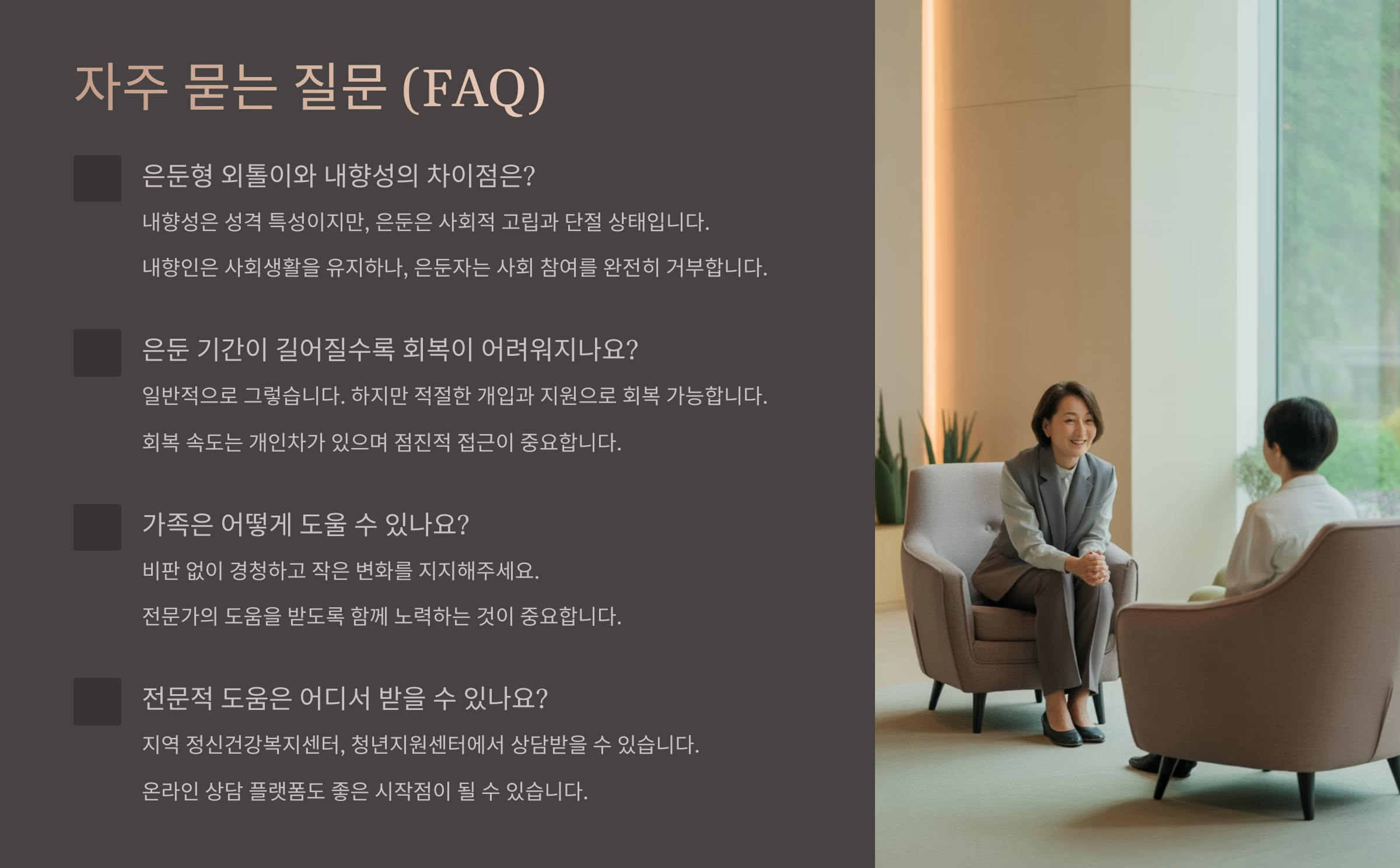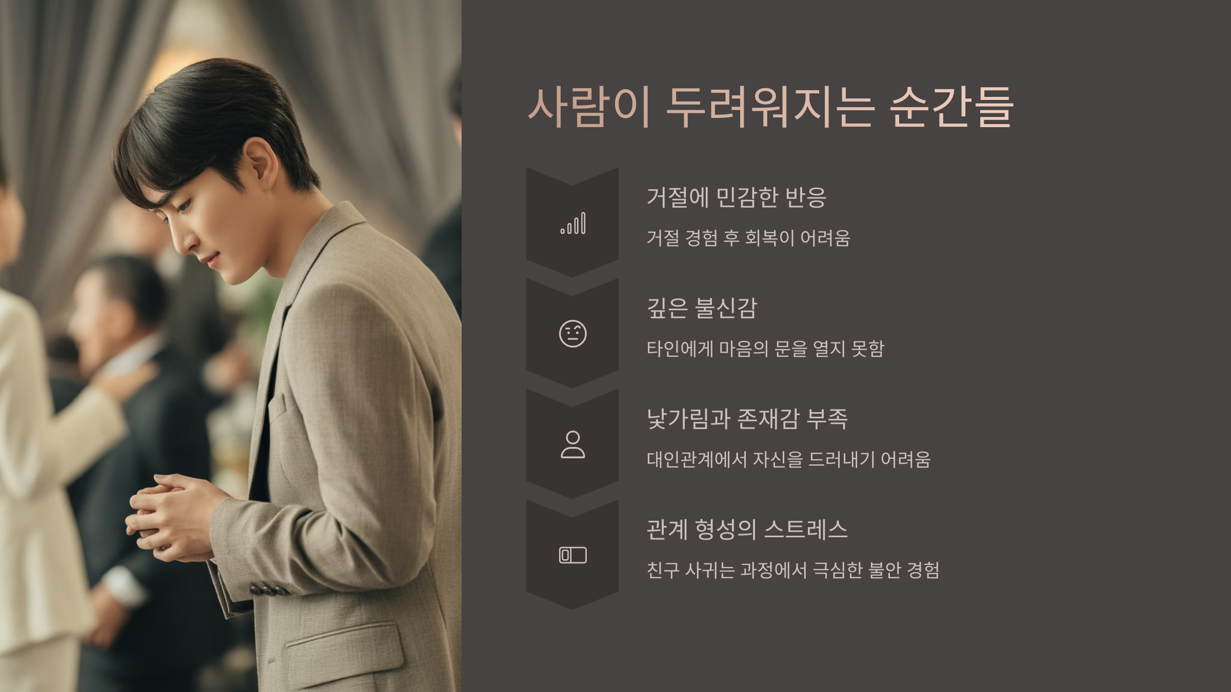 요인 설명 사회적 상처 직장, 학교, 가정 내 갈등과 따돌림 정신 건강 문제 우울증, 불안장애, 공황장애 등 과거 트라우마 폭력, 학대, 관계 실패 경험 자존감 부족 계속된 실패와 비교로 인한 자기 비하 내가 생각했을 때, 가장 큰 원인은 ‘나는 안 될 거야’라는 마음이 굳어버리는 순간이었어요. 누군가를 마주하는 게 부담스럽고, 그들의 기대를 채우지 못할까봐 도망치게 되는 거죠.