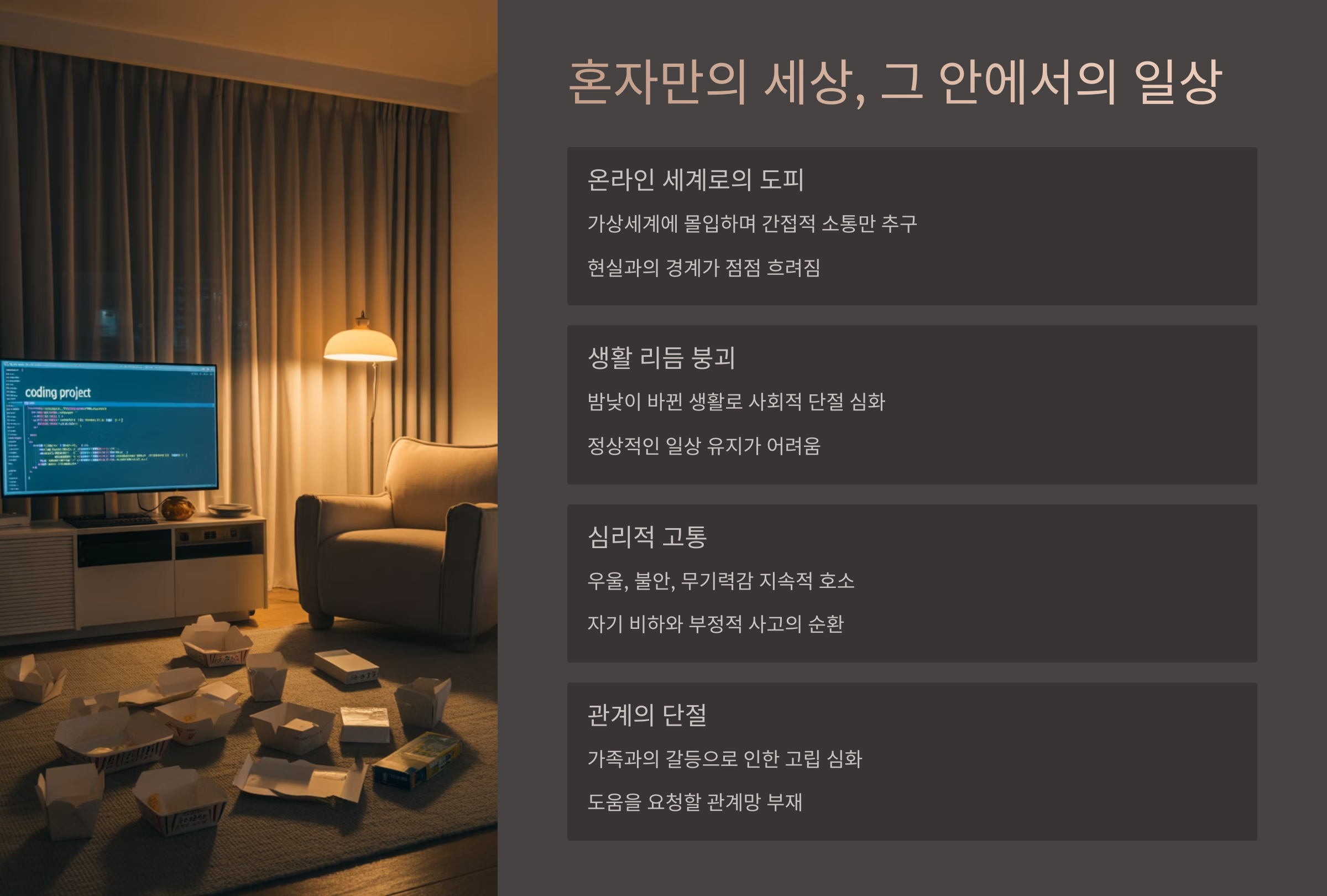 낮과 밤이 뒤바뀌고, 가족과도 말하지 않게 돼요. 배달음식으로 끼니를 해결하고, 창문조차 열지 않는 날도 많았어요. 몸이 점점 무거워지고, 걷는 것도 버거워졌죠.