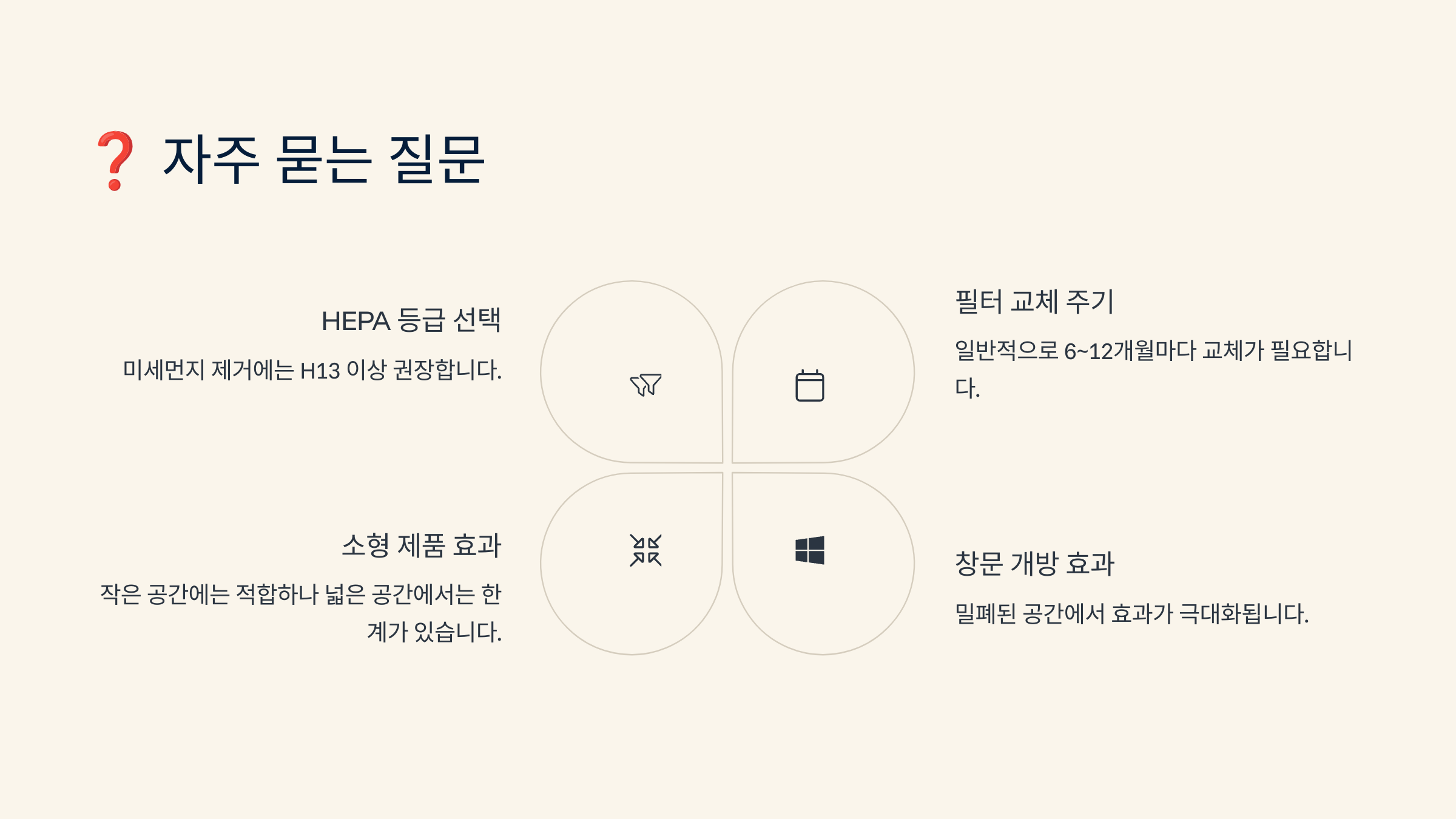 Q1. 공기청정기는 몇 시간씩 틀어야 하나요?A1. 실내 공기 상태에 따라 다르지만 일반적으로 하루 8~12시간 이상 권장해요.