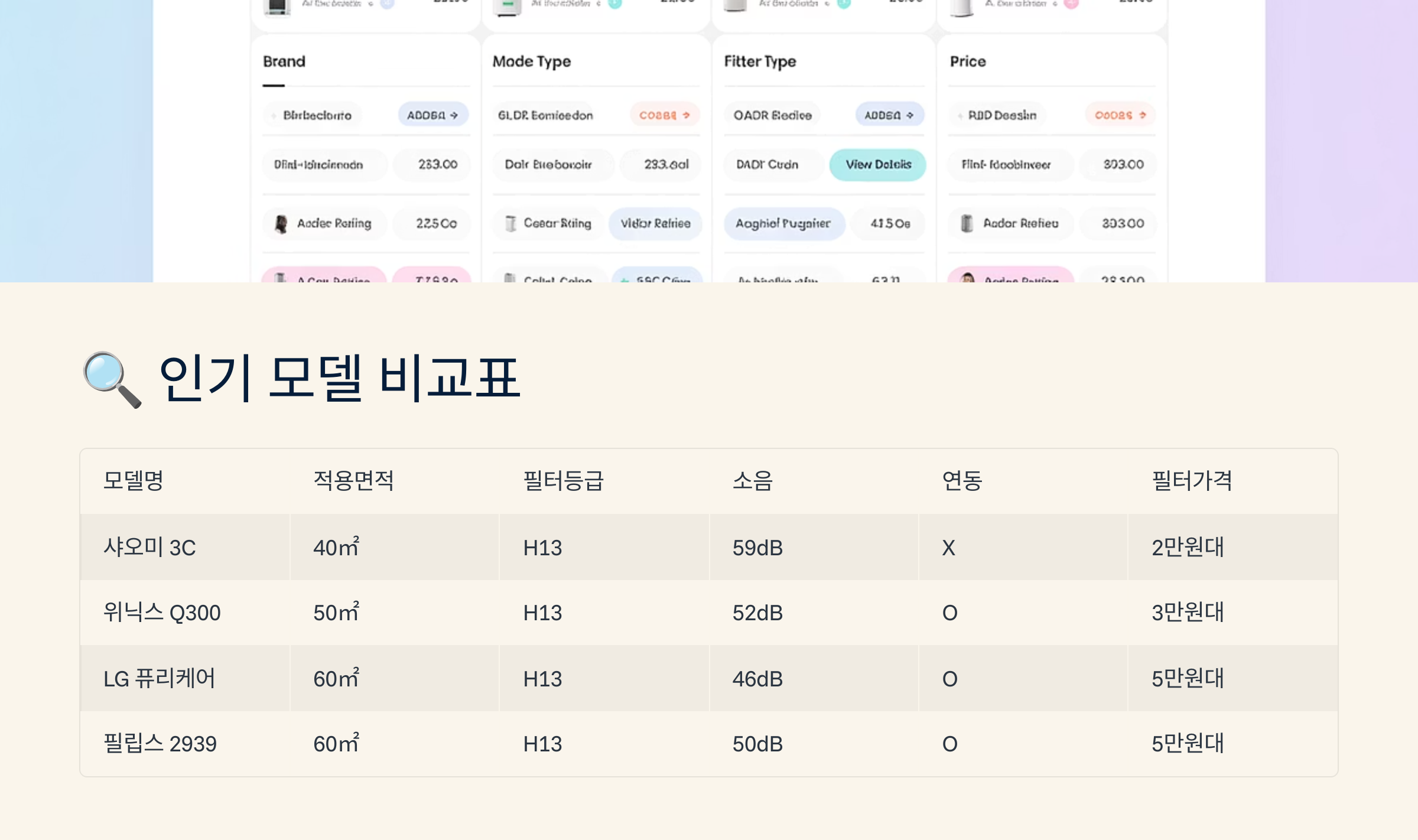 인기 모델 비교표 지금까지 소개한 공기청정기들을 한눈에 비교할 수 있도록 표로 정리해봤어요! 😎