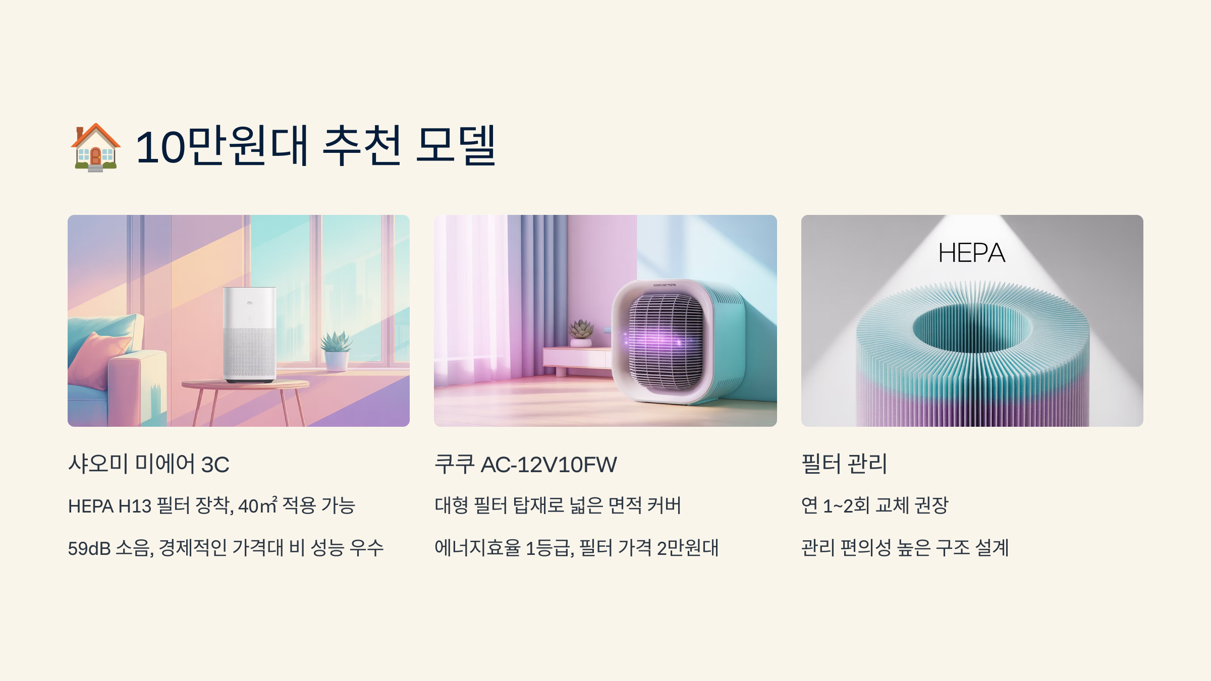10만원대 추천 모델 10만원대에서도 꽤 괜찮은 성능을 가진 공기청정기를 찾을 수 있어요! 주로 원룸, 소형 방에 적합한 모델들이죠.