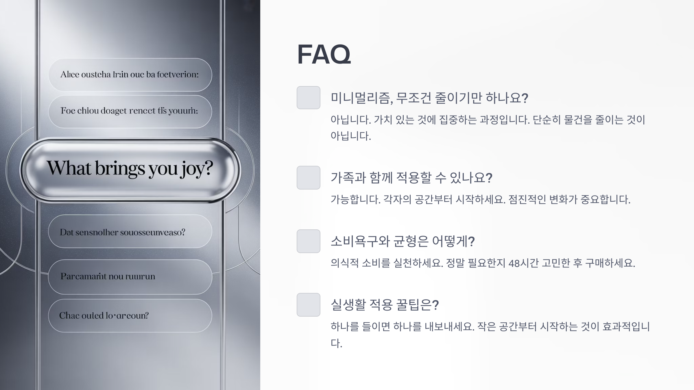 Q1. 미니멀리즘을 처음 시작할 때 가장 좋은 방법은?A1. 가장 간단한 것은 하루 한 가지 물건을 비우는 것부터 시작하는 거예요. 부담 없이 가볍게 실천해보세요!