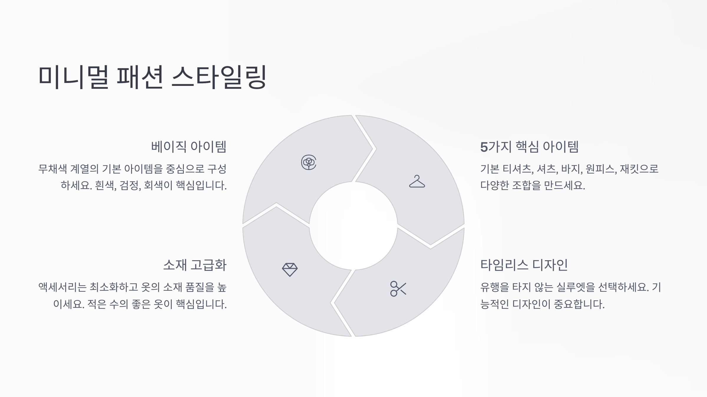 2025년 미니멀 패션은 ‘적지만 강한 인상’을 주는 스타일이 대세예요. 심플하지만 완성도 높은 룩을 만드는 게 목표랍니다. 🎯대표적으로 ‘캡슐 옷장(Capsule Wardrobe)’이 인기를 끌고 있어요. 소수의 베이직 아이템만으로 다양한 스타일링을 할 수 있게 조합하는 거예요. 흰 셔츠, 블랙 팬츠, 베이지 트렌치코트 같은 기본 아이템은 필수죠.