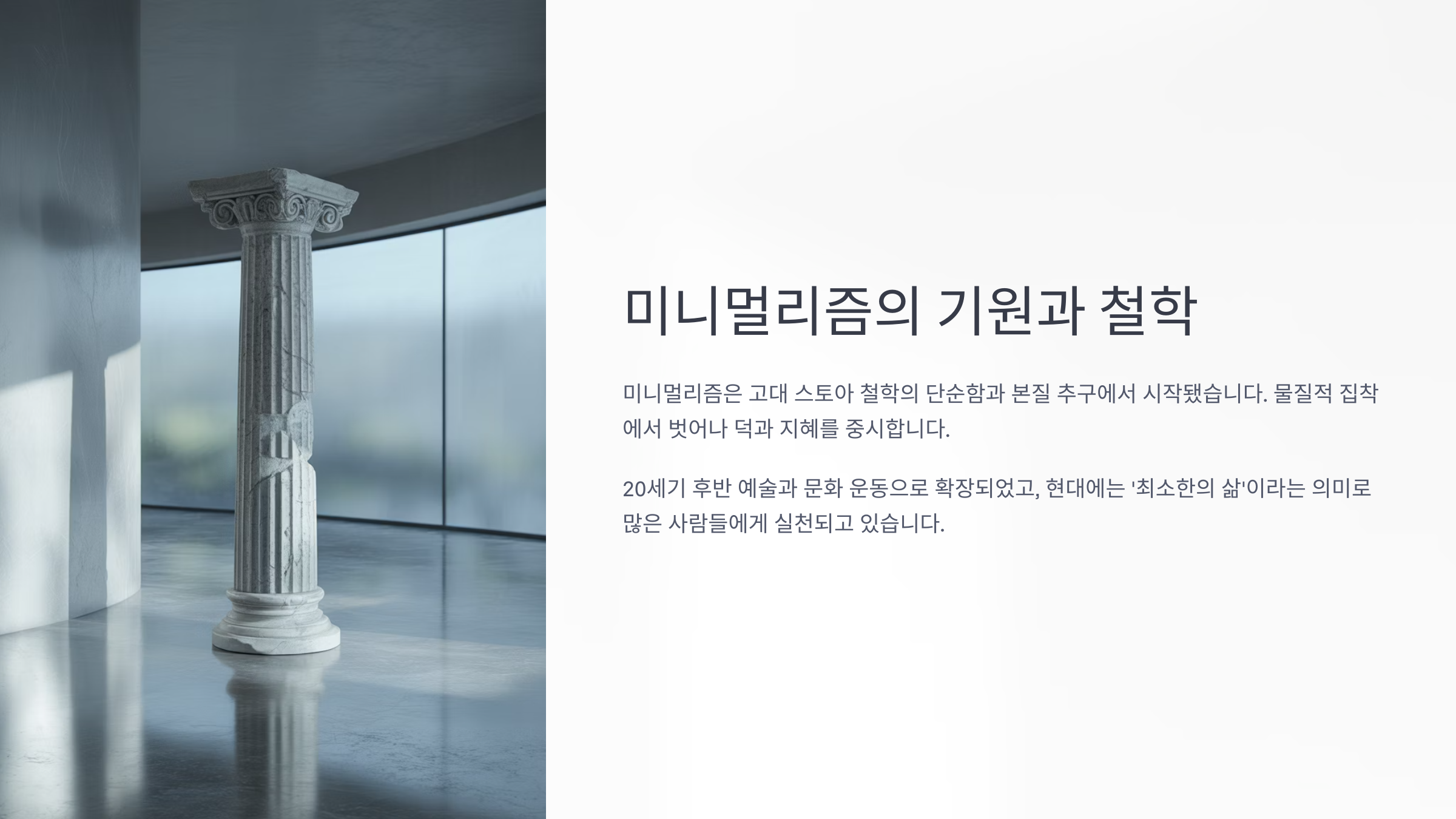 미니멀리즘이라는 개념은 20세기 초반 예술과 건축 분야에서 처음 등장했어요. 복잡하고 장식적인 스타일에 반기를 들며, '단순함'과 '기능성'을 강조하는 움직임으로 시작됐죠.특히 바우하우스(Bauhaus) 학교는 기능성과 심플함을 결합한 디자인을 널리 퍼뜨렸어요. "형태는 기능을 따른다(Form follows function)"라는 말이 미니멀리즘 정신을 잘 보여주지요.