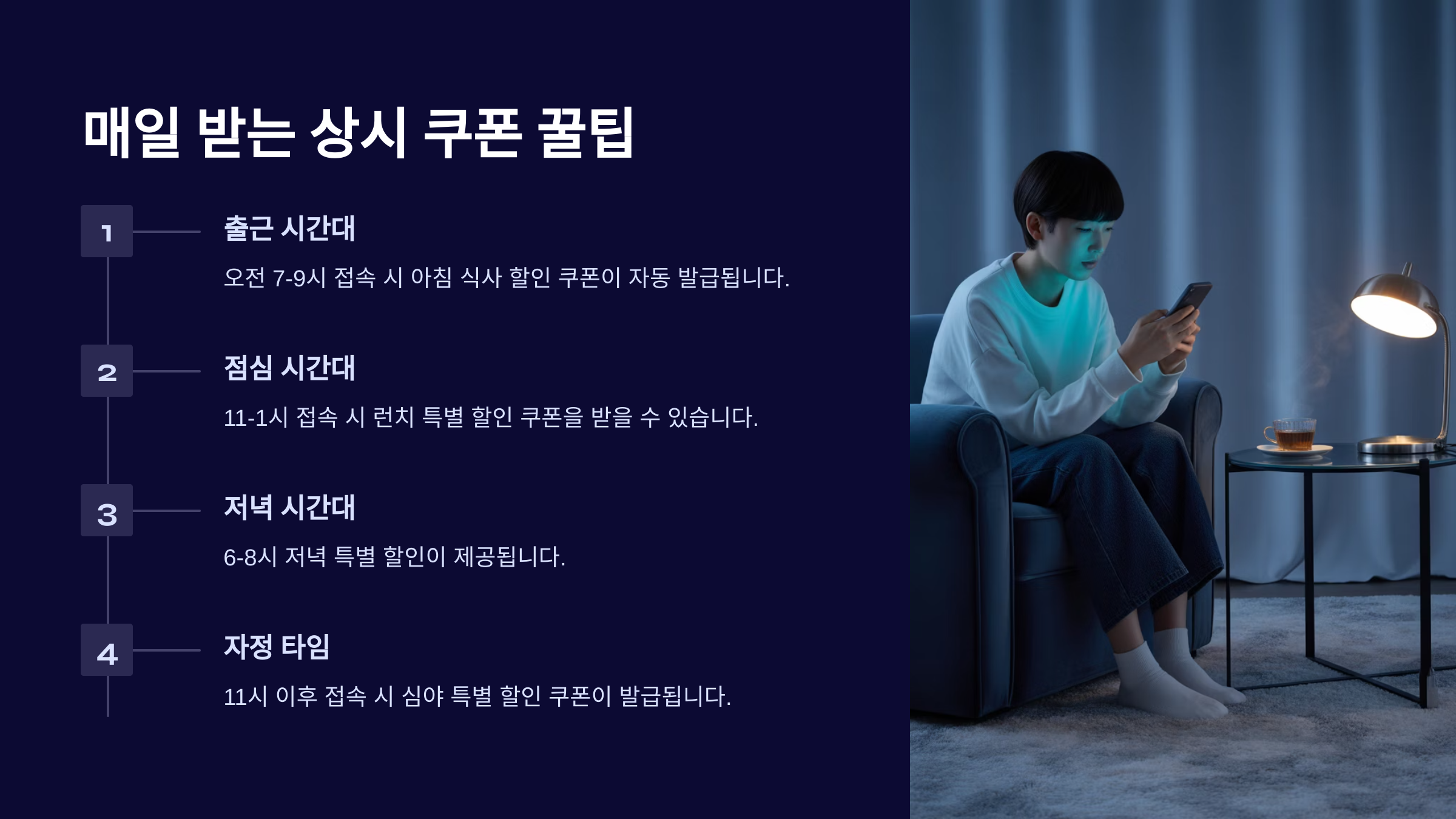 또한 시간대별 할인 이벤트도 많아요. 예: 오전 11시~오후 2시 점심타임 쿠폰 / 오후 6시~9시 저녁 할인 등 하루 2번 이상 체크하는 습관만 들여도 할인 폭이 커져요!